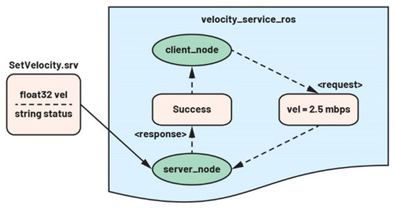 例如,在图三中,server_node提供服务SetVelocity.srv以更改命令速度vel。该服务接受float32格式的速度值,并以字符串格式返回状态;如果设置了请求的速度,则为"success";否则,为"FAIL"。
