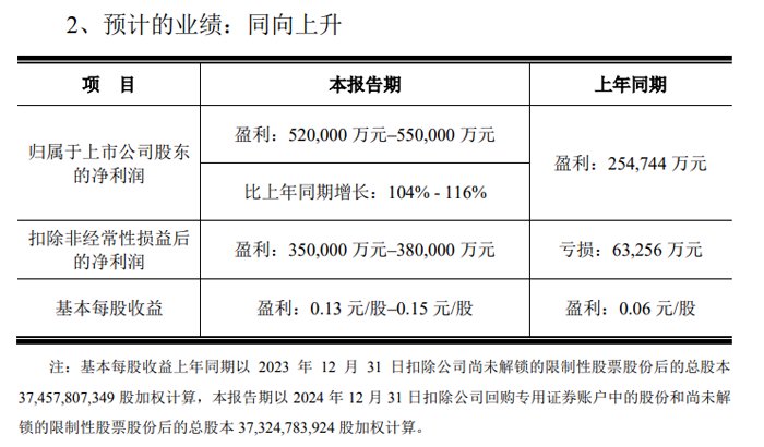 预计 2024 年年度实现扣非净利润49,000 万元到 57,000 万元,与上年同期相比,将增加 36,368 万元到 44,368 万元,同比增长 287.91%到 351.24%。