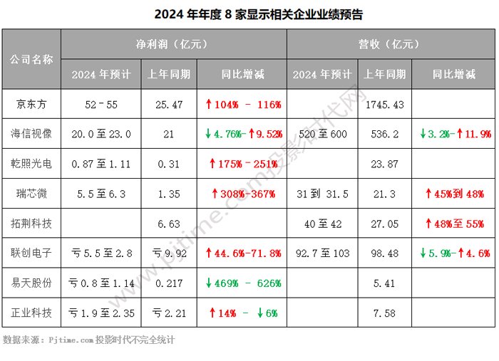 1月20日晚间,BOE京东方、海信视像、乾照光电、瑞芯微、拓荆科技、联创电子、易天股份、正业科技等8家面板、电视、投影、LED芯片、显示芯片、车载显示、制造装备等显示相关企业相继发布2024 年度业绩预告。