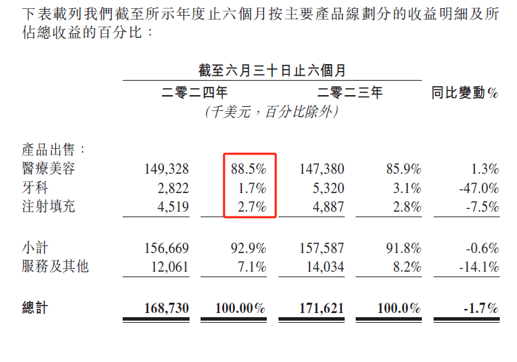 2024年上半年,复锐医疗科技收入主要来自于医疗美容,收入占比达到88.5%,同比增长1.3%。来自注射填充、牙科业务的收入占比较小,2024年上半年均不足5%。