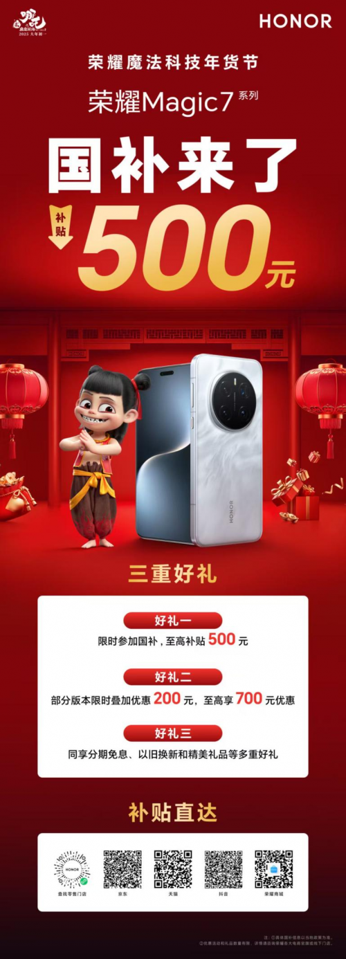 随着2025年国家“两新”政策的加力扩围,手机等消费品的购新补贴方案正式亮相,为消费者带来了实实在在的福利。荣耀作为科技行业的领军品牌,积极响应国家政策号召,率先携旗下多款热门机型加入国家补贴计划,为消费者精心打造了一场前所未有的购机狂欢。值此新春佳节之际,荣耀Magic6系列与Magic7系列限时国补大促正式拉开帷幕,让消费者在新的一年里以更加优惠的价格,尽享前沿科技产品的魅力。同时荣耀魔法科技年货节也已开启,钜惠福利额外加成,为消费者带来前所未有的优惠风暴!