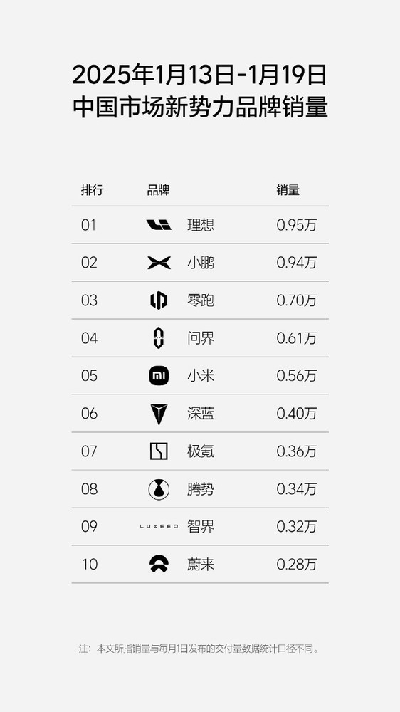 【CNMO科技消息】1月21日,理想汽车发布最新周销量数据,在2025年1月13日-1月19日中国市场新势力品牌销量排行上,理想汽车以周销量0.95万辆排在第一。小鹏紧随其后,周销量为0.94万辆;问界则以0.61万辆排在第四位,而小米汽车以0.56万辆的成绩位列第五。
