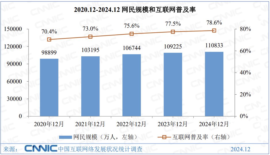 C114讯 1月21日消息(颜翊)1月17日,中国互联网络信息中心(CNNIC)在京发布第55次《中国互联网络发展状况统计报告》(以下简称《报告》)。《报告》显示,2024年是我国全功能接入国际互联网30周年。30年间,我国互联网建成了全球规模最大、技术领先的互联网基础设施,构建起全球最大的网络零售市场和网民群体。网民规模从1997年的62万人增长至2024年的11.08亿人,互联网普及率升至78.6%。