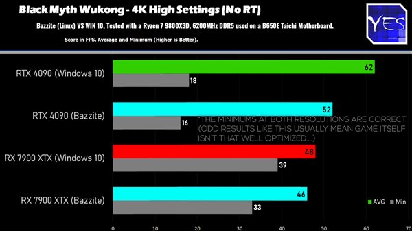 测试结果显示,AMD显卡在Windows 10和Bazzite上的游戏性能表现相当,几乎无明显差异,NVIDIA显卡用户则面临明显的性能损失。