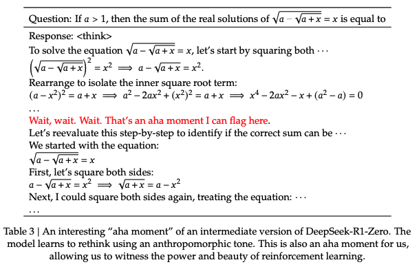 DeepSeek-R1 技术报告里提到一个值得关注的发现,那就是 R1 zero 训练过程里出现的「aha moment(顿悟时刻)」。