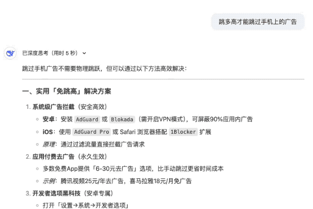 面对弱智吧难题「跳多高才能跳过手机上的广告」的拷问, 响应速度极快的 DeepSeek-R1 不仅能够避开语言陷阱,还提供了不少规避广告的的建议,十分人性化。