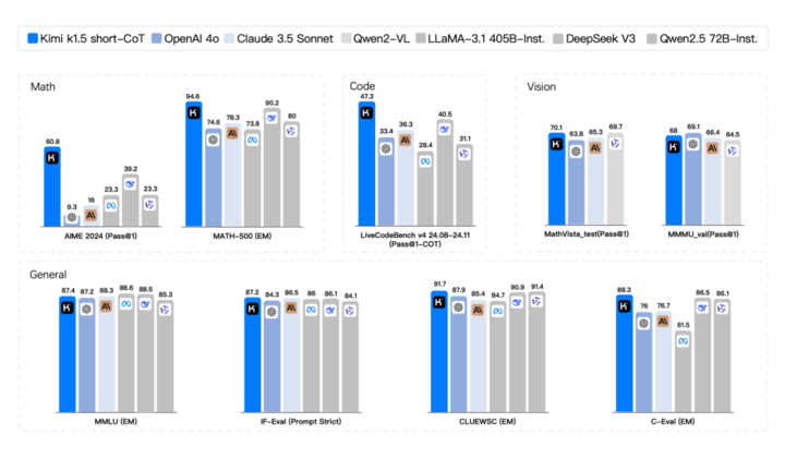 在短思考模式(short-CoT)的较量中,Kimi k1.5 展现出压倒性优势,其数学、代码、视觉多模态和通用能力全面超越了行业翘楚 GPT-4o 和 Claude 3.5 Sonnet。
