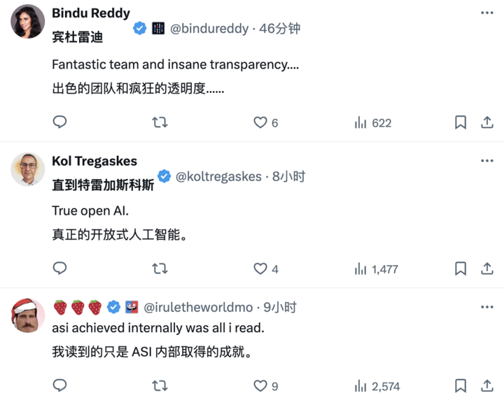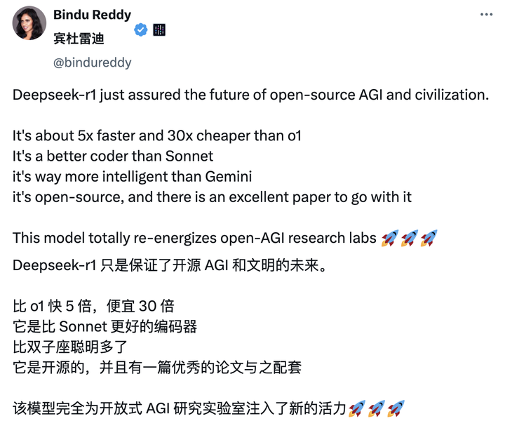 DeepSeek-R1 发布以后,也再次在海外 AI 圈引起轰动,收获了大量「自来水」。其中,博主 Bindu Reddy 更是给 Deepseek 冠上了开源 AGI 和文明的未来之称。