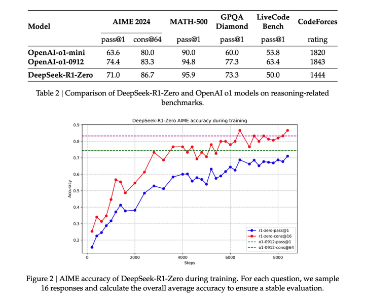 在模型的中期训练阶段,DeepSeek-R1-Zero 开始主动重新评估初始解题思路,并分配更多时间优化策略(如多次尝试不同解法)。换句话说,通过 RL 框架,AI 可能自发形成类人推理能力,甚至超越预设规则的限制。