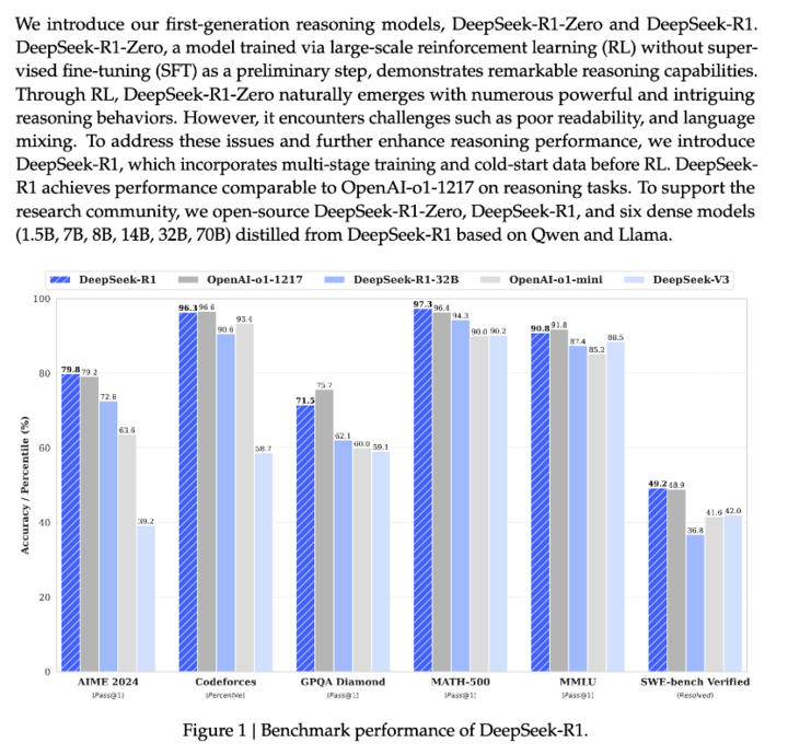 DeepSeek 通过对 DeepSeek-R1-Zero 和 DeepSeek-R1 这两个 660B 模型的蒸馏,开源了 6 个小模型。其中,32B 和 70B 型号在多个领域达到了 OpenAI o1-mini 的水准。