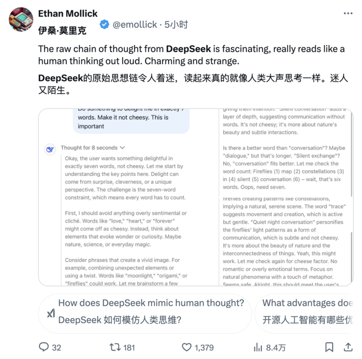 甚至也有网友特别欣赏 DeepSeek-R1 所展示的思维链,认为「像极了人类的内心独白,既专业又可爱」。