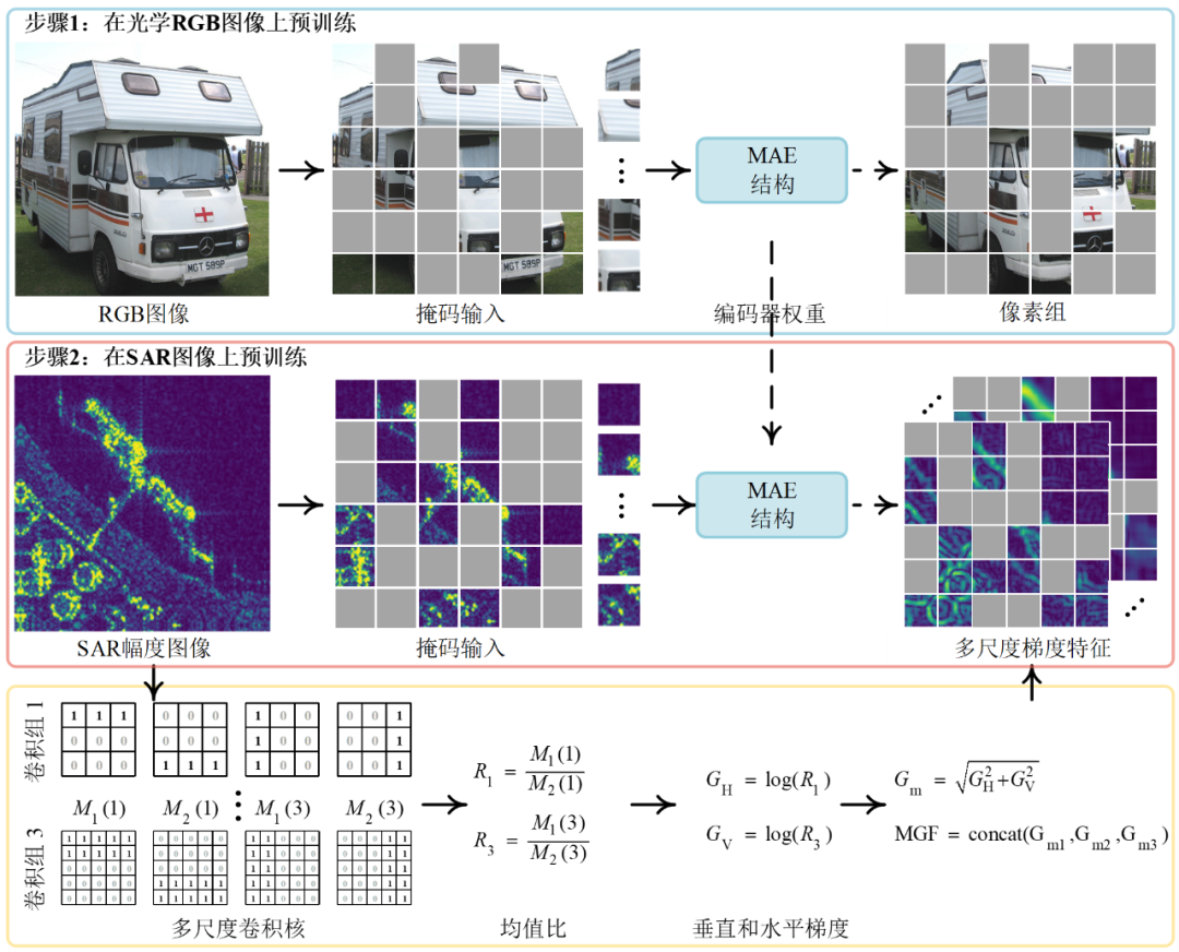 图 2. 两步预训练过程。第一步是对 ImageNet 数据进行预训练,以获得更好的初始化模型多样性。第二步是利用高质量的目标信号对 SAR 图像进行预训练,比如抑制散斑噪声和提取目标边缘的多尺度梯度特征。