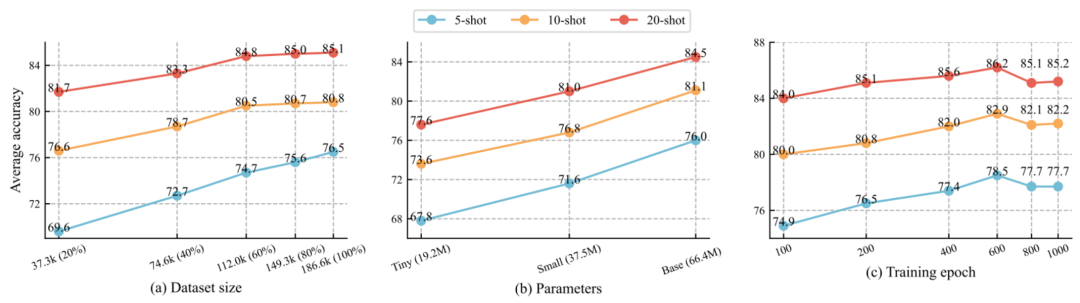 图 6. SARATR-X 在数据集大小、模型参数量和训练轮数方面的可扩展性。虽然方法受益于这三个方面,但需要注意的是,由于数据集的大小,过大的训练轮数经常会导致过拟合。