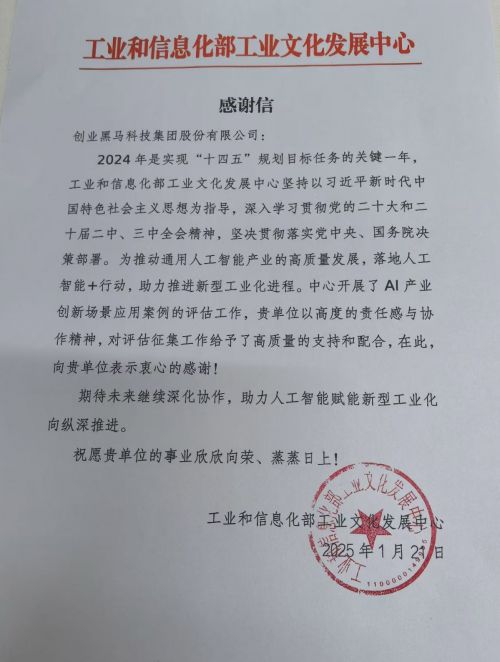 i黑马讯 2024年,为推动通用人工智能产业的高质量发展,工信部工业文化发展中心开展的Al产业创新场景应用案例的评估工作,创业黑马集团有幸参与评估征集工作,获得中心的高度认可。