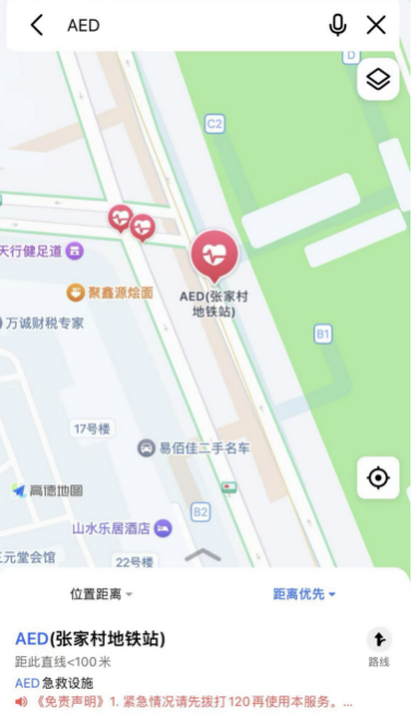 项目上线后,上述两地用户在高德地图内即可一目了然AED点位,直观找到离自己最近的AED设备,并可通过点击地图上的图标,查看点位的地址、服务时间等信息,还可直接通过高德导航到设备点位。
