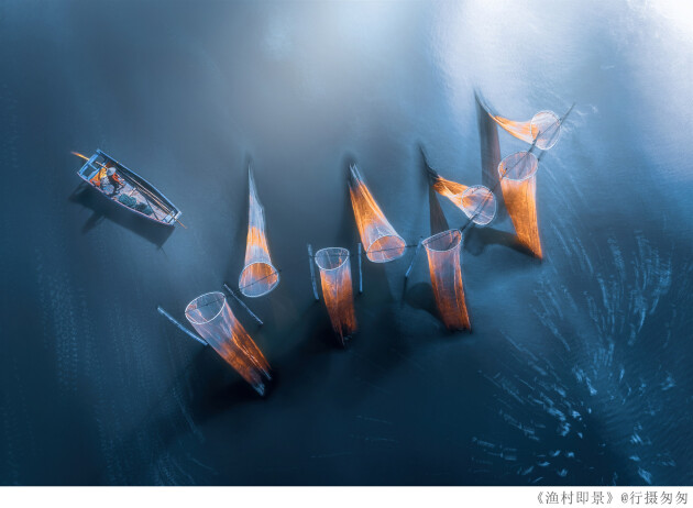涨潮时分,海水渐渐淹没角网,一叶小舟慢慢驶来。“我通过连拍三十张堆栈仿慢门的方式,拍出了这张作品。”《渔村即景》是创作者“行摄匆匆”在福建宁德南塘澳村拍摄的连家船画面。著名风光摄影师,评委Daniel Kolder对此认为:“他的照片捕捉了霞浦南塘澳村的独特风光。潮水逐渐淹没渔网的瞬间,小船缓缓驶来,散发出诗意而宁静的氛围。将三十张照片叠加起来模拟长时间曝光的技术,在水面上营造出丝绸般光滑的质感,增加了画面的梦幻色彩。”