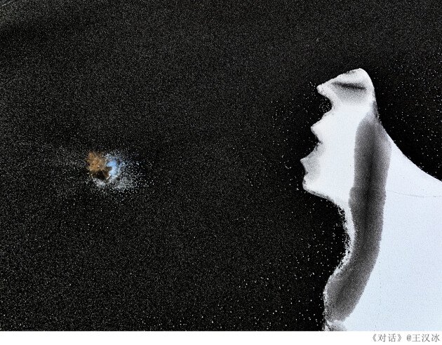 王汉冰的另一幅作品《对话》同样使用胡杨树作为创作对象,却营造出了一幅截然不同的风格画面。他分享道:“雪后的湖面上形成了一幅自然与人对话的画面,让人联想翩翩。”评委Luke Stackpoole对此评价道:“这幅作品像是艺术和摄影的融合。湖面的黑色和冰层的白色形成了凹凸有致的鲜明对比,营造了抽象且近乎画意的效果。它充满神秘,是一幅引人深思的作品。”