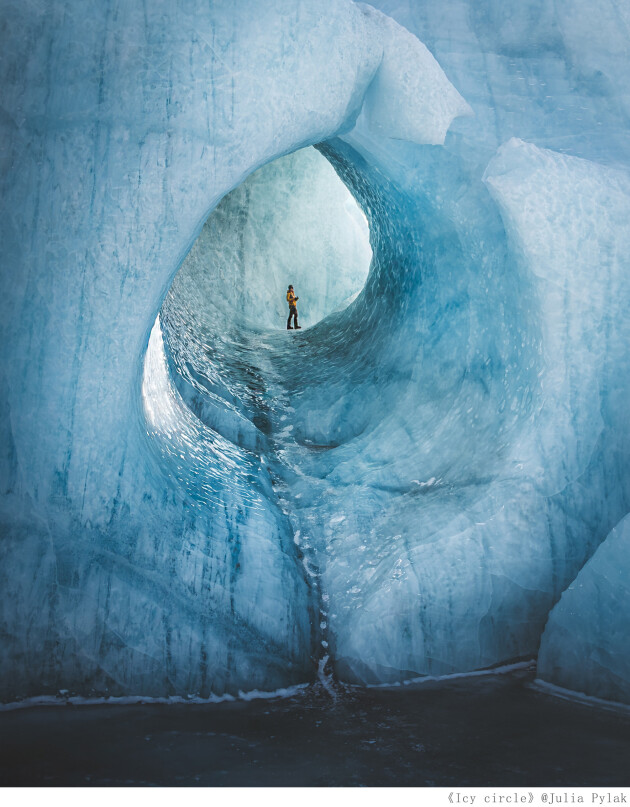 摄影师Julia Pylak在冰岛的冰洞中拍摄下这幅极具探索意味的画面,作品《Icy circle》让人感觉仿佛走进了另一个世界。2023年世界新闻摄影奖得主,评委储卫民(Thomas看看世界)对作品给予赞赏:“这张照片的拍摄场景十分独特,冰洞的形状与纹理都非常的迷人,人物的色彩与冰形成了很好的对比,同时也告诉了读者冰川的宏大尺度。”