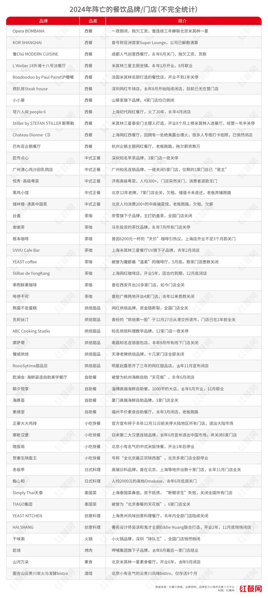 “很遗憾,要和大家说再见!”临近年底,台湾知名小吃品牌“正豪大大鸡排”发布通知,其上海新世界城店于2024 年12月26日停止营业,中国大陆地区的所有门店,都将陆续于2024年12月31日前闭店。随后,话题#正豪大大鸡排关闭中国大陆所有门店#登上热搜,这个在中国大陆开了10多年的炸鸡品牌突然“下线”,令人唏嘘。然而,这仅仅是2024年餐饮行业动荡的冰山一角。数据显示,过去一年,近300万家餐饮门店折戟,创下历史新高。“收缩”和“闭店”成为餐饮业2024年度热词,撤离、退市、创始人跑路……各类负面消息也是此起彼伏,寒意袭人。破产、闭店、跑路……一大批餐厅没熬过“寒冬”红餐网不完全统计发现,过去一年,不少餐厅已悄然消失在大众视野之中,涉及正餐、茶饮、咖啡、烘焙、火锅、甜品、自助餐、小吃快餐、酒馆、烤肉等各大品类。在西式正餐领域,从老品牌到黑珍珠、米其林餐厅,一批曾经风光无限的高端西餐,纷纷陷入破产、跑路、欠薪、被追债的泥沼,以极其狼狈的姿态从大众视野中“消失”。例如,连续三年蝉联北京米其林一星的Opera BOMBANA,曾是北京辉煌一时的顶级意大利餐厅,由米其林三星大厨创立,却在2024年4月一夜倒闭,不仅拖欠员工薪资、供应商货款,甚至还出现被供应商堵到店门口追讨货款的尴尬局面;上海的L'Atelier 18外滩十八号法餐厅,同样有米其林三星主厨坐镇,但年初开业,年中便倒闭,只撑了短短半年;Roodoodoo by Paul Pairet沪嘟嘟,由法国米其林名厨操刀,开业不足1年也黯然退场。还有在上海风靡了20年的穹六人间 people 6,以及被誉为“深圳最难预定牛排店”的网红牛扒店燃扒房Steak house等,也同样难逃闭店命运。在咖啡、茶饮、烘焙三大热门赛道上,倒下的企业也不少。将一杯咖啡卖到6200元“天价”的根本咖啡,上海店开业不到3个月便倒闭,其在广州的最后一家门店也在2024年1月关闭,至此全国仅有的4家门店已全部关闭;奈雪的茶旗下主打奶盖茶的台盖,于2024年4月关停;曾在西安开出十多家门店的“季煦鲜果咖啡”,已于2024年6月门店全关;有明星光环加持的谢谢茶,也在7月曝出全国门店歇业的消息。烘焙赛道,网红烘焙品牌“熊猫不走蛋糕”、南昌知名连锁面包品牌“摩萨哥”、天津老牌烘焙“慢城烘焙”,也相继关闭了线下所有门店。此外,自助餐、小吃快餐、日料、火锅、烤肉等赛道,也有一些品牌或知名单店已从中国内陆市场消失。例如厦门高端海鲜自助品牌“海鼎荟”的3家门店已全部关闭;日本第二大汉堡连锁品牌“摩斯汉堡”,2024年6月宣布退出中国市场,并关闭6家门店;高端日料品牌“赤坂亭”,曾在北京、上海等地开出数十家门店,2024年11月关闭了全部门店。除了这些已经倒下、消失的品牌、单店之外,还有一大批品牌的门店规模已明显缩减。茶饮赛道,有着“大学生白月光”之称的厝内小眷村,巅峰时在国内80多城开出近500家店,截至12月初,只剩下不足50家店;伏小桃从300多家门店缩减至2家门店;圆真真奶茶巅峰时期有300家店,如今也仅剩10来家店苦苦支撑。咖啡赛道,曾经的咖啡界“老二”太平洋咖啡,过去一年陆续关闭了100多家门店;连锁咖啡品牌Seesaw净减少20多家门店,创始人被限高;果咖代表品牌“本来不该有·鲜果咖啡”过去一年关闭了近600家门店,门店锐减8成左右。火锅赛道,“江浙沪泰式火锅鼻祖”Just Thai泰式火锅,门店数从最多时的十几家减至如今的3家;明星品牌“贤合庄”门店还在不断收缩,如今仅剩下50余家店;被誉为“沪上火锅顶流”的熊猫老灶火锅,曾开出过10多家门店,目前仅剩2家门店仍在营业;作为“美蛙鱼头火锅开山鼻祖”的哥老官美蛙鱼头,全国门店数已从巅峰时期的100多家减至60余家。此外,中式正餐、烘焙甜品、小吃快餐、日料、自助餐等赛道,同样上演着残酷的洗牌,多个品牌的门店数量锐减。洗牌是必然,后面可能还有一波更猛烈的闭店潮事实上,过去一年里,无论是那些完全离场的,还是大规模闭店的,可能都遭遇过共同的难题。需求层面来看,消费者已越来越理性,诸如高端餐饮、网红餐厅等不具备刚需属性,且价格又比较高的品类就会受到很大冲击。如燃扒房Steak house、bistro囿吉山、Just Thai泰式火锅等网红品牌,以及雏Chú MODERN CUISINE、山河万朵、Roodoodoo by Paul Pairet沪嘟嘟等高端餐饮店,普遍人均消费都达到了数百、上千,乃至数千元。过去这些餐厅依赖于特定消费群体的高频次消费和口碑传播,还能保持稳定经营。但如今,外部环境的不确定性增加,中产阶级资产缩水,大部分人的消费观都趋于理性务实,大家会追求更具性价比、更具刚需的餐饮品类。网红餐饮店和高端餐厅想要持续吸引消费者复购,就愈发困难。客流量明显下滑,再加之居高不下的经营成本重压,网红餐饮店和高端餐厅,以及一些不具备刚需的品类就会逐渐失去市场竞争力,陷入困境。行业层面,全国餐饮门店已严重供给过剩。供大于求,行业内卷加剧,自然就会导致出清现象越来越普遍。沙利文相关数据表明,中国每千人就拥有7家餐饮门店,这项数据在世界排名第一。企查查数据也显示,截至12月25日,全国现存餐企数量为1682.2万家,比去年同期多出了125.3万家。可以说,当前的餐饮业已经严重供给过剩。民食之本创始人欧峰也指出,餐饮行业在经历了高速增长之后,进入到了滞胀到衰退的过程,如果明年经济大盘有所好转,2025