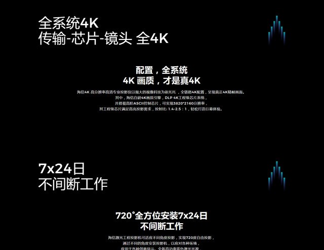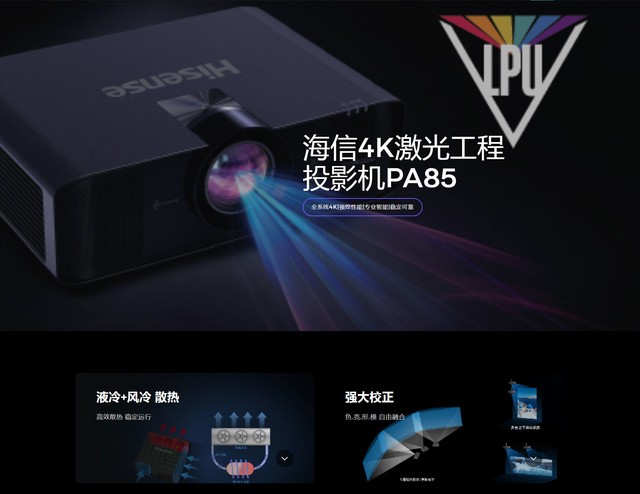 (中关村在线 四川行情)海信PA85新款工程投影机,采用DLP激光投影技术,0.65英寸DMD芯片,标准分辨率为3840x2160(4K),8500ANSI流明高亮度,3000000:1超高对比度,60Hz刷新率,清晰明亮久看不累,光源寿命更是长达25000小时。电动变焦,自动聚焦,投射比为1.4-2.5:1,投影尺寸60-500英寸,支持手动几何校正、拍照校正、多点校正、弧形校正、可选内置融合。PA85搭载多种无线投屏方式,手机、电脑、iPad皆可实现轻松投屏,且快速响应、稳定投放,有效管控,安全无扰。