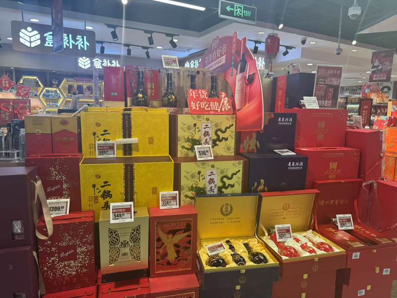 “五粮液和泸州老窖的礼盒装走得比较好。”据盒马鲜生工作人员介绍,除单瓶白酒外,部分白酒礼盒可以享受盒马会员优惠,如八代五粮液双瓶礼盒限时特价2199元,而盒马会员在会员日购买时还可再享8.8折优惠,折算下来每瓶仅需约968元;泸州老窖1573双瓶礼盒特价1998元,会员日购买同样可享受8.8折,每瓶约合880元。