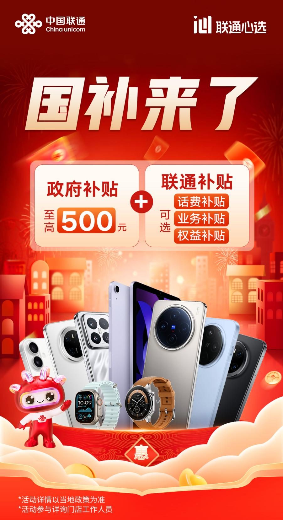 自有品牌和定制产品赋能——中国联通自有品牌的手机、平板和智能手表(手环)已全面申报纳入国补范围。同时,与中国联通深度合作的定制联合产品也将纳入国补范围。此外,中国联通还与终端厂商推出“国补产品推荐清单”,并通过营业厅和合作渠道提供正规发票和可靠售后,让消费者放心选购。