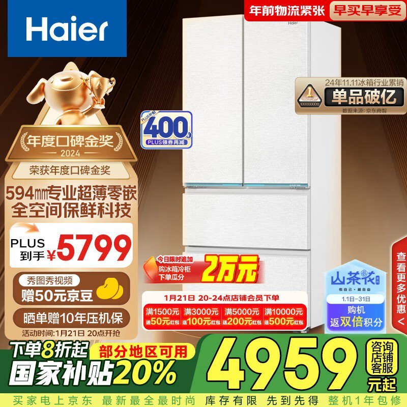 海尔 Haier BCD-485WGHFD1BWLU1 家用大容量电冰箱,到手价4063.88