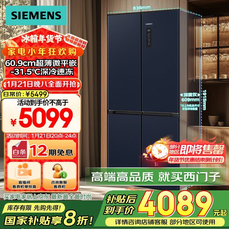 西门子十字星系列超薄微平嵌冰箱促销中 4061元到手
