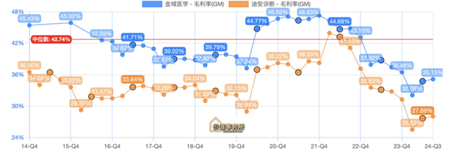 这就说明整个行业的利润情况在2024出现了恶化,即便不看净利率,看毛利也差不多,不论金域还是迪安,这段时间的毛利都不太好看,即便和疫情前的2019年相比都有不少幅度的下滑。