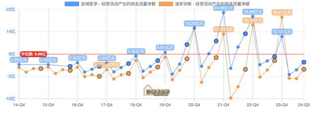 2020-2022这三年间,金域、迪安的现金流比起以往暴涨了好多倍,哪怕是疫情结束的2023,现金流比起疫情前的2019也有非常大的飞跃,也就2024稍微差了点意思,但也是大大高于利润的。截至2024Q3,金域医学的现金流净额为3.12亿,迪安诊断为0.54亿,都是正的,不过金域比迪安要多,整体来看,金域的现金流情况一直比迪安好。