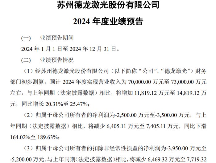 1月21日晚间,苏州德龙激光股份有限公司发布2024 年度业绩预告,预计 2024 年度实现营业收入为 70,000.00 万元至 73,000.00 万元左右,与上年同期(法定披露数据)相比,将增加 11,819.12 万元至 14,819.12 万元,同比增长 20.31%至 25.47%;