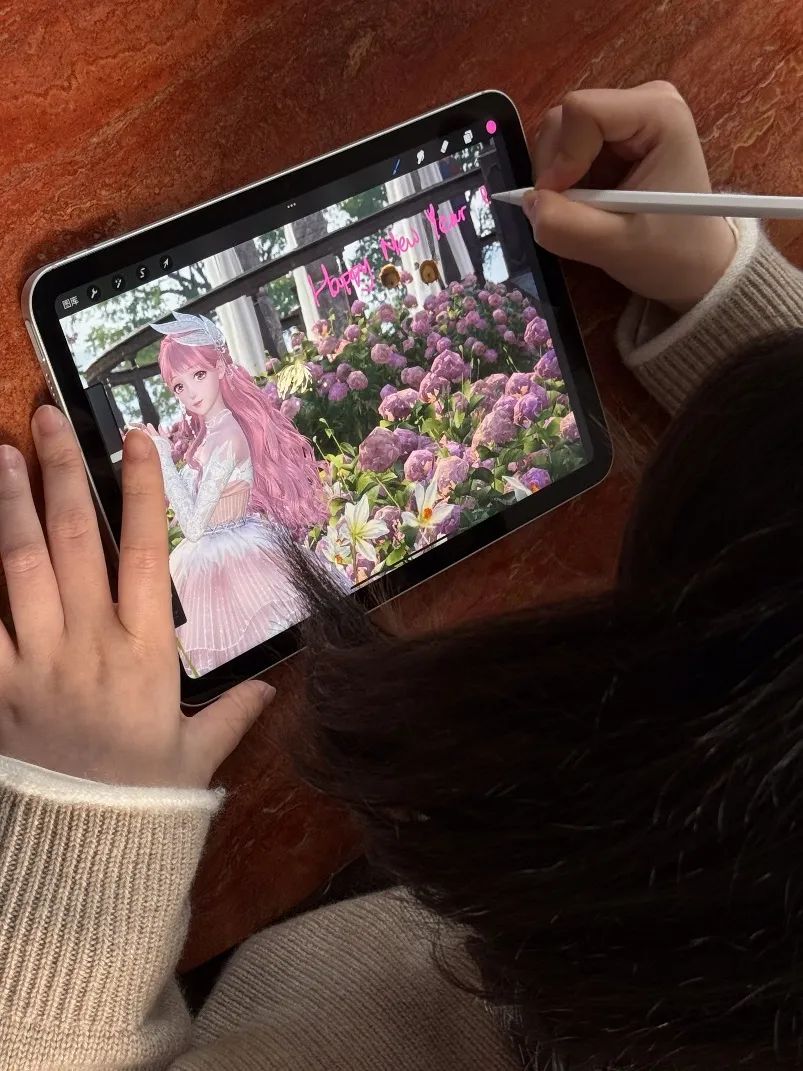 在现场试玩的时候,《无限暖暖》还提供了一个展开游戏二创的使用场景——玩家在游戏中使用内置的相机截图,本就附带了多种滤镜可供选择,随机就能在图片加工App中,用Apple Pencil再添上几笔自己的想法,再一步就能直接发布到社交网络上了,整个过程感觉要比在电脑或手机上操作起来都更丝滑。