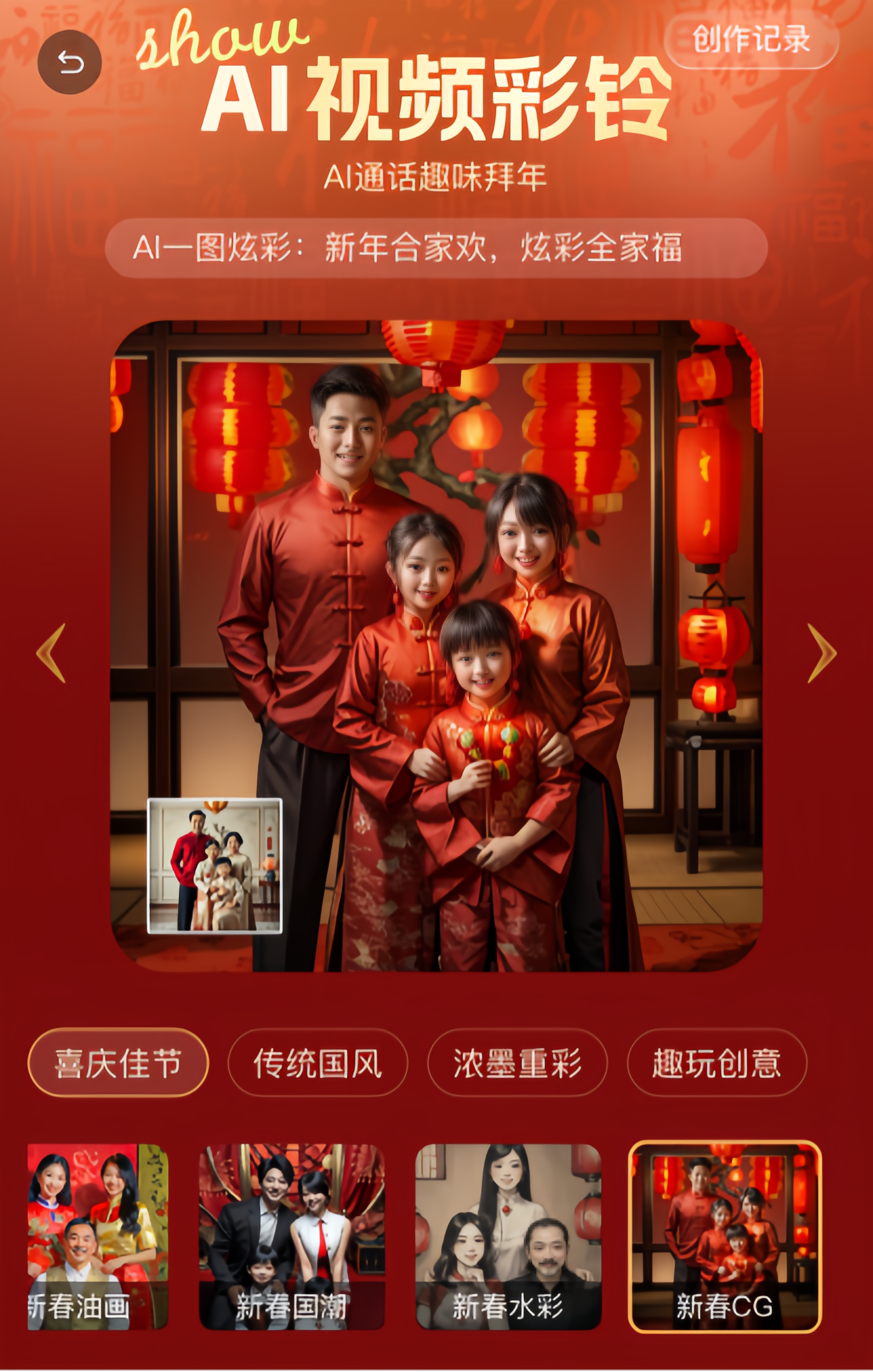 从用相机拍全家福装进相框,到用手机拍全家福装进相册,再到如今用AI视频彩铃,上传一张全家福照片就能生成一支风格化短视频,晒全家福的方式更有“AI”了。“AI一图炫彩”就是这样一个神奇的创作工具,只需上传一张与家人的合照,就能一键变换成传统国风、浓墨重彩、趣玩创意、现代潮流等丰富风格,AI一键智能处理,就能解锁一支9秒或15秒带新年BGM的欢乐视频,在来电中携全家人一起向亲朋好友拜年。