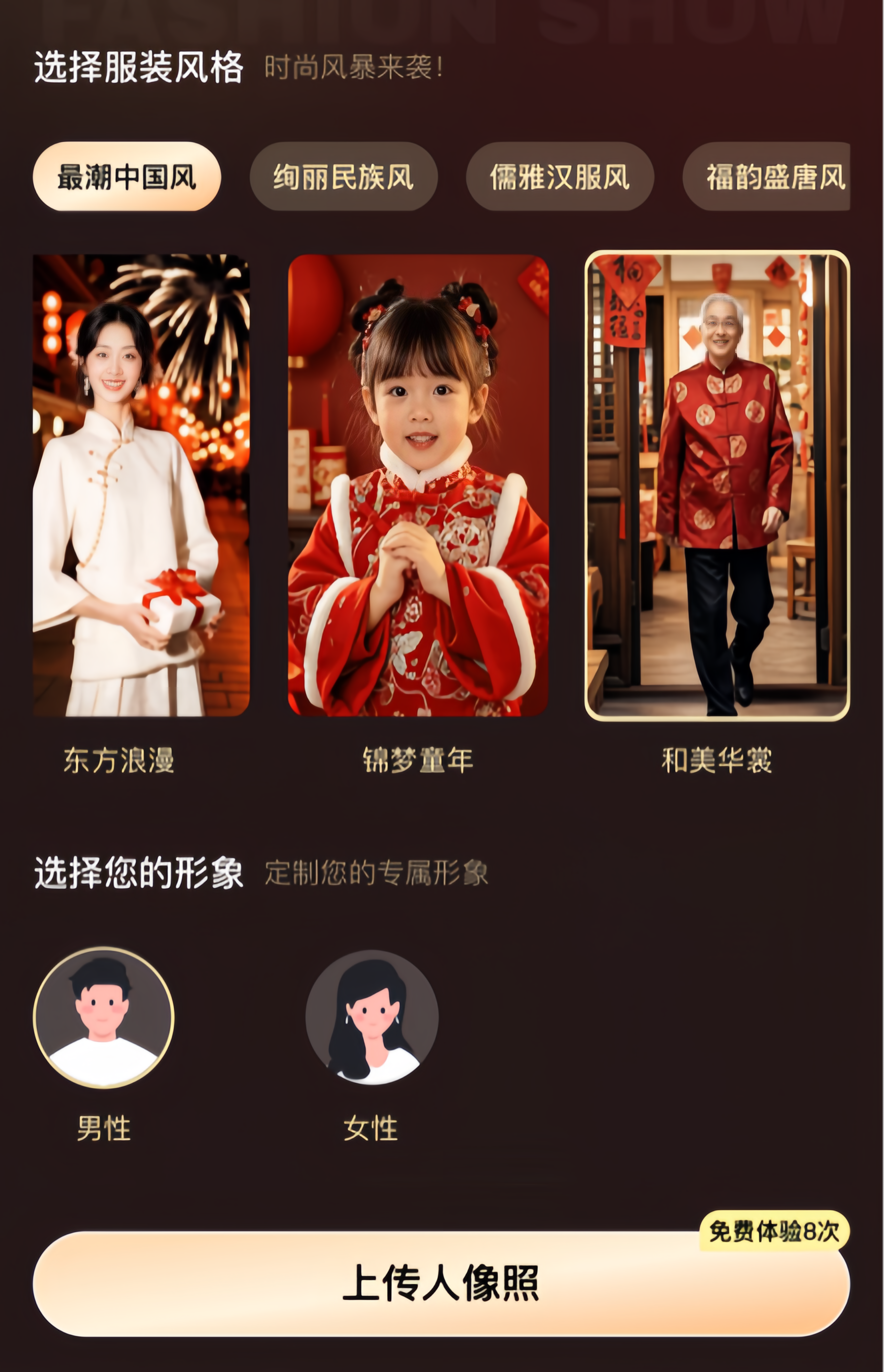 “AI一图变装”上线56个民族的服饰模板,上传个人照片,选择你喜欢的风格即可一键换装,国潮、汉服、盛唐、清宫……百变华服一键穿,换装同时还能“穿越”不同朝代和不同风景中。丰富的模板还融合了杨柳青年画、舞狮等非遗元素,将地域民俗韵味浓缩到15秒的短视频中,让每一个人都能秀出新年新气象,设为视频彩铃让祝福先你一步到家。