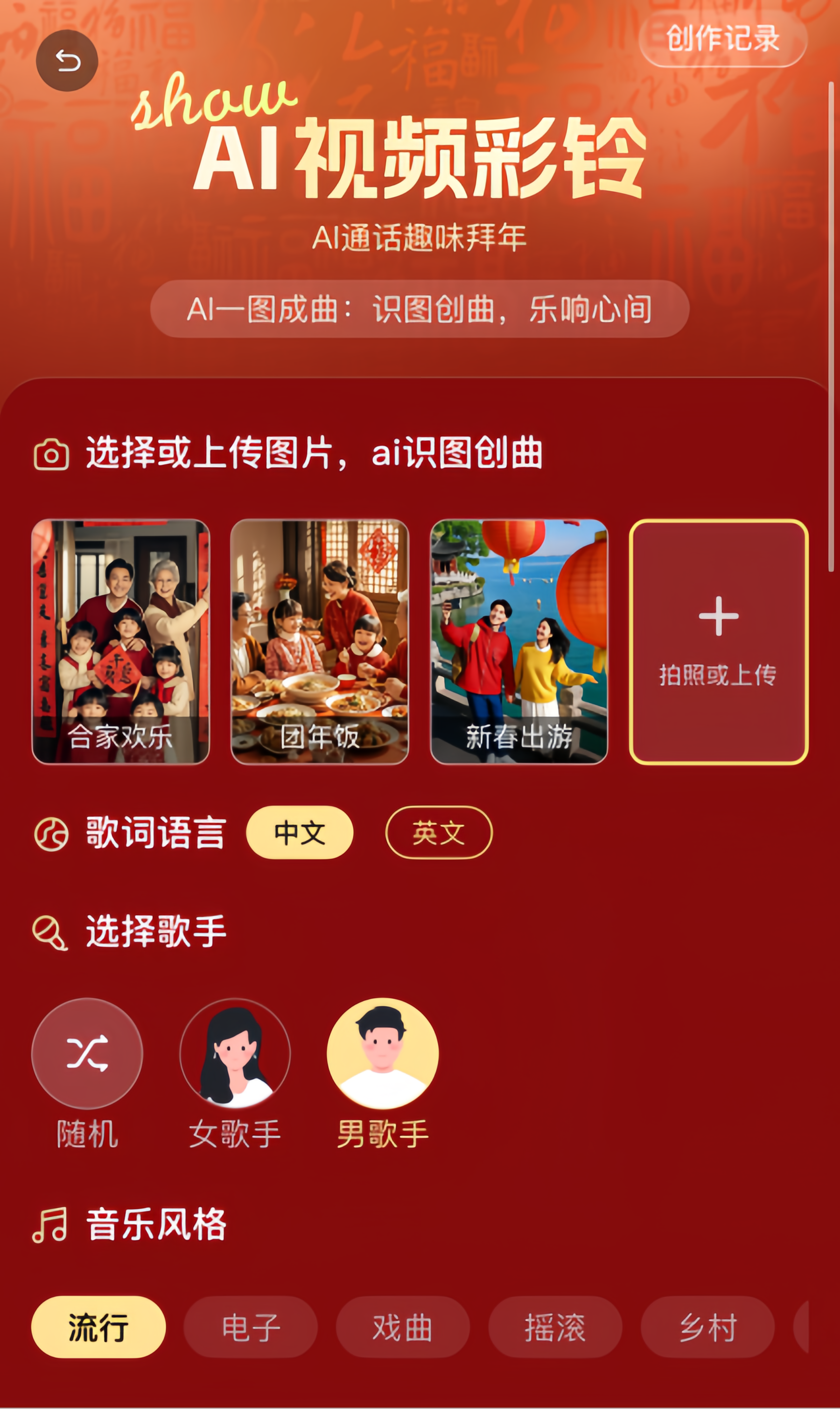 春节的钟声回荡在耳畔,团圆的温馨弥漫在心间。在这个阖家欢乐的时刻,如何让祝福更加动听、更加贴心?“AI 一图成曲”功能来帮忙,不管是温馨的家庭聚会,还是热闹的街头巷尾,只要上传一张有新年氛围的照片,AI 就可以智能判别场景情感,搭配最合适的旋律与歌词,一键生成专属的拜年BGM。您的拜年祝福,会伴着动人音乐,在每次来电时,给亲朋好友送上别样的惊喜与感动。