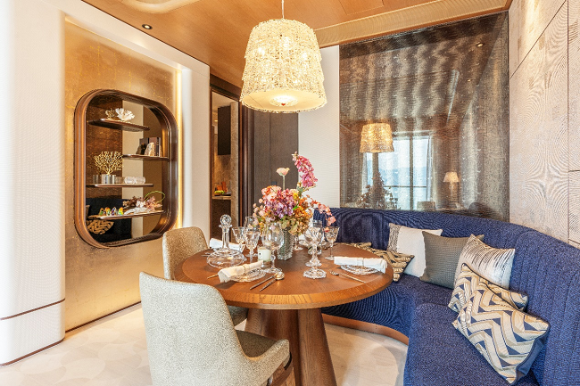 而巴卡拉的水晶艺术珍品更是整个空间的点睛之笔。 巴卡拉创立于 1764 年,260 年来持续缔造辉煌的水晶世界,世世代代秉承对于卓越质量的坚持,每一件佳作无不经过多次的精雕细琢,开创水晶艺术的先河,在秉承精湛工艺的同时不断进步,并坚持每件作品都于法国制造。今次「天泷」的巴卡拉主题家居摆放了近 40 件巴卡拉的水晶艺术珍品,包括灯饰、装饰摆设、相架、烛台、餐具及酒瓶连酒杯等,单单是居室内的巴卡拉艺术藏品,价值超过港币 30 万元,当中更包括畅销产品或经典系列,广受市场追捧及推崇。其中,单位大厅摆放由国际知名设计大师 Arik Levy 设计的 Tuile de Cristal 水晶瓦片吊灯,采用新式切割工艺打造,梦幻的灯罩宛如结霜的雪片,带来极致闪耀的现代感,属近年品牌惊艳之作。 这些水晶珍品错落有致地摆放于各个角落,在灯光的映照下,散发着璀璨迷人的光辉,让整个空间充满了艺术与奢华的气息。每一件水晶制品都像是一个无声的讲述者,诉说着巴卡拉悠久的历史和精湛的工艺,与室内的装修风格相互辉映,共同营造出一种如梦如幻的奢华氛围。