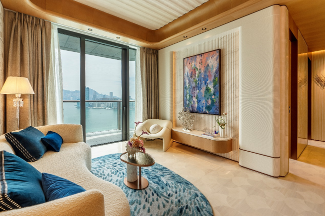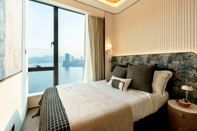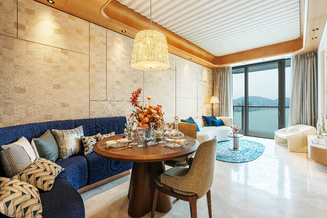 踏入第 7 座 30 楼 A 室,仿佛踏入了一个纯粹巴卡拉艺术殿堂。知名设计工作室 via. 以法国蔚蓝海岸 French Riviera 为灵感源泉,将法式临海的浪漫与优雅巧妙地融入到单位设计之中。客饭厅以米色及胡桃木色为主调,营造出温馨而大气的氛围。那象征海洋的蓝色弧型沙发及装饰品,宛如大海的灵动与深邃在此处定格,与约 3 米阔的流线型露台相得益彰,将迷人的维多利亚港景色毫无保留地引入室内,让自然美景与室内奢华完美交融。