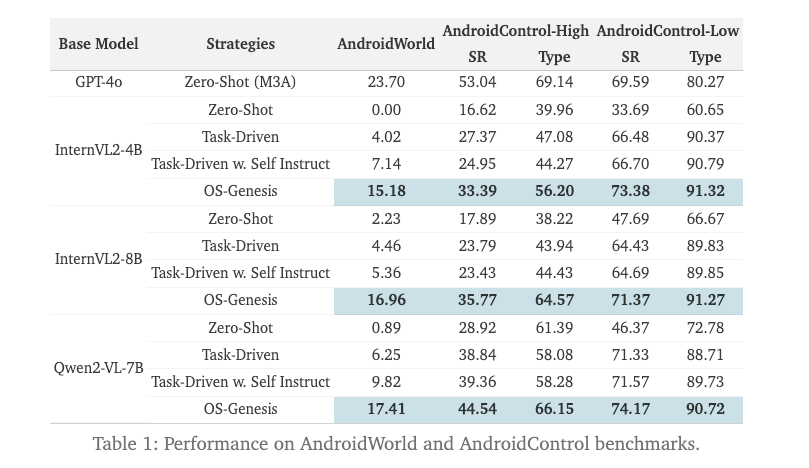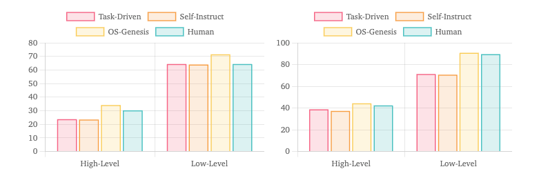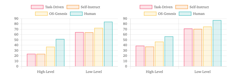 作者首先比较了 OS-Genesis 生成的高阶指令与人工编写的高阶指令在任务执行中的效果。实验基于 AndroidWorld 的 500 个人工标注轨高阶任务,采用 GPT-4o 探索其对应轨迹,并用这些轨迹训练基于 InternVL2-8B 和 Qwen2-VL-7B。为保证公平性,OS-Genesis 和各 baseline 的轨迹数量保持一致。