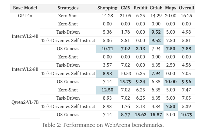 OS-Genesis 在 WebArena 中的表现也显著优于基线方法。对于复杂的交互式网页任务(如 GitLab 和 Reddit),本工作的 agent 相比 Task-Driven 方法提升了约 50%。在多个动态网页场景中,通过 OS-Genesis 生成的数据,agent 表现出了更高的多样性和泛化能力,特别是在需要多步操作的任务中,其生成轨迹更符合逻辑和用户意图。