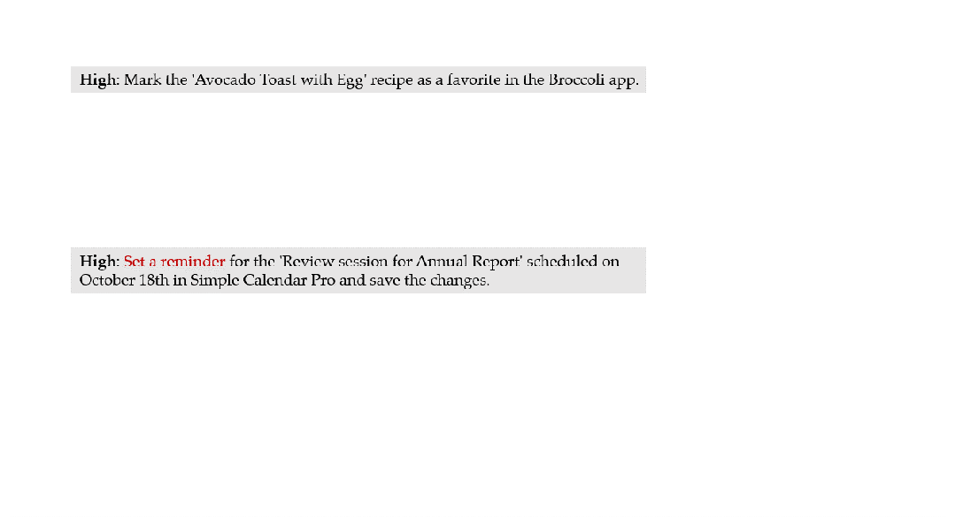 高阶指令:明确规定任务目标,例如 “将 Broccoli 应用中的‘Avocado Toast with Egg’标记为收藏”。