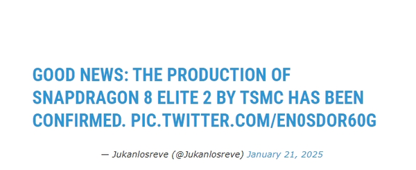 【CNMO科技消息】高通最新旗舰处理器骁龙8 Elite采用台积电第三代3纳米(N3E)工艺制造。而近日,有关其继任者骁龙8 Elite 2的制造信息浮出水面。消息源“Jukanlosreve”在X平台发文:“TSMC生产骁龙8 Elite 2已获确认。”这表明,高通在芯片生产上并未考虑转向三星代工。
