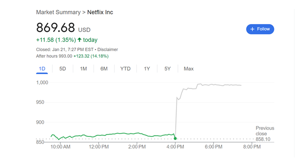 美东时间周二,奈飞公司公布了第四季度财报后,该公司股价盘后飙升逾14%。