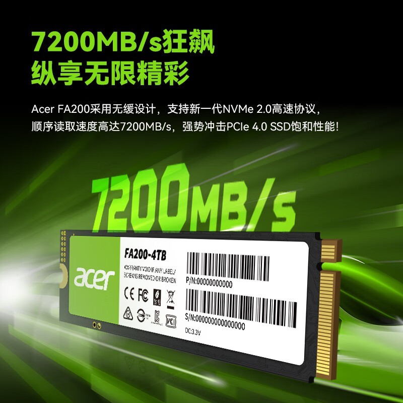 宏碁 掠夺者SSD PCle3.0/4.0固态硬盘 FA200 4T 1359元限时购