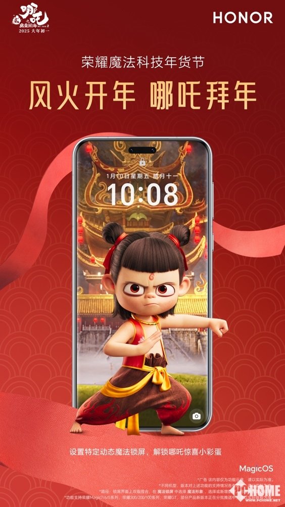 新年荣耀,风火开年。荣耀魔法科技年货节期间,荣耀与春节大片《哪吒之魔童闹海》风火联动,持续为消费者带来惊喜的互动体验。此前,荣耀陆续上线了哪吒贺春魔法锁屏、哪吒之魔童闹海主题,哪吒和敖丙相机水印等一系列个性化功能。这些充满了国潮元素的定制化功能,不仅让手机和手表界面焕然一新,还让用户在拍照分享时,感受到浓浓的年味。