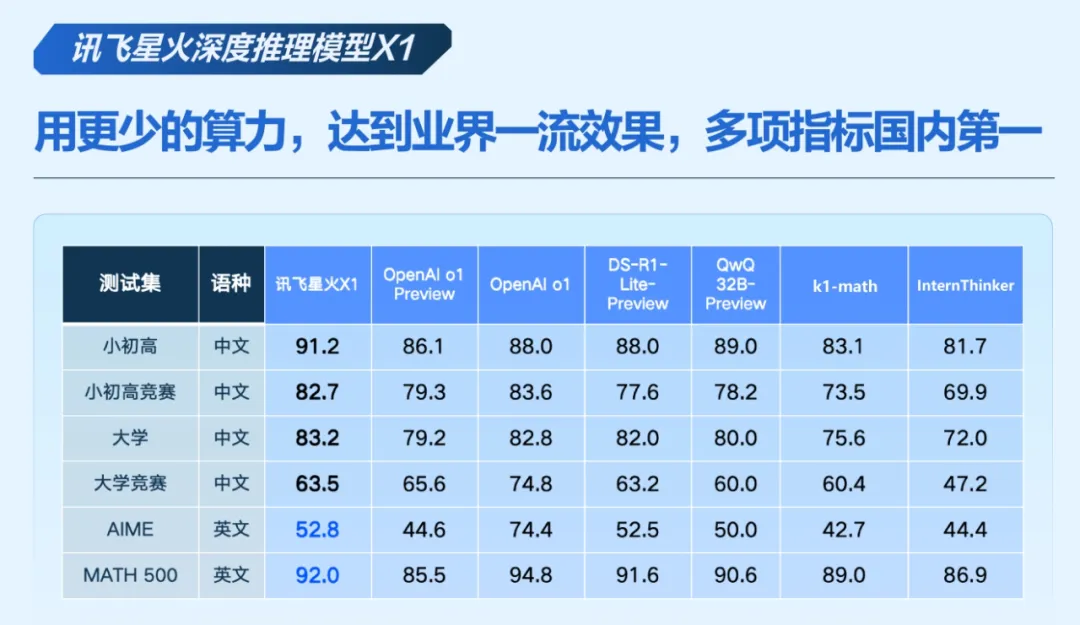 在模型能力的深度上,数学题就是最好的试炼场。以科大讯飞近期发布的星火深度推理模型X1为例,其在小初高(含竞赛)、大学(含竞赛)、AIME、MATH500等多项考试中,取得了亮眼成绩,得分水平处于业界第一梯队,且多项指标国内第一。