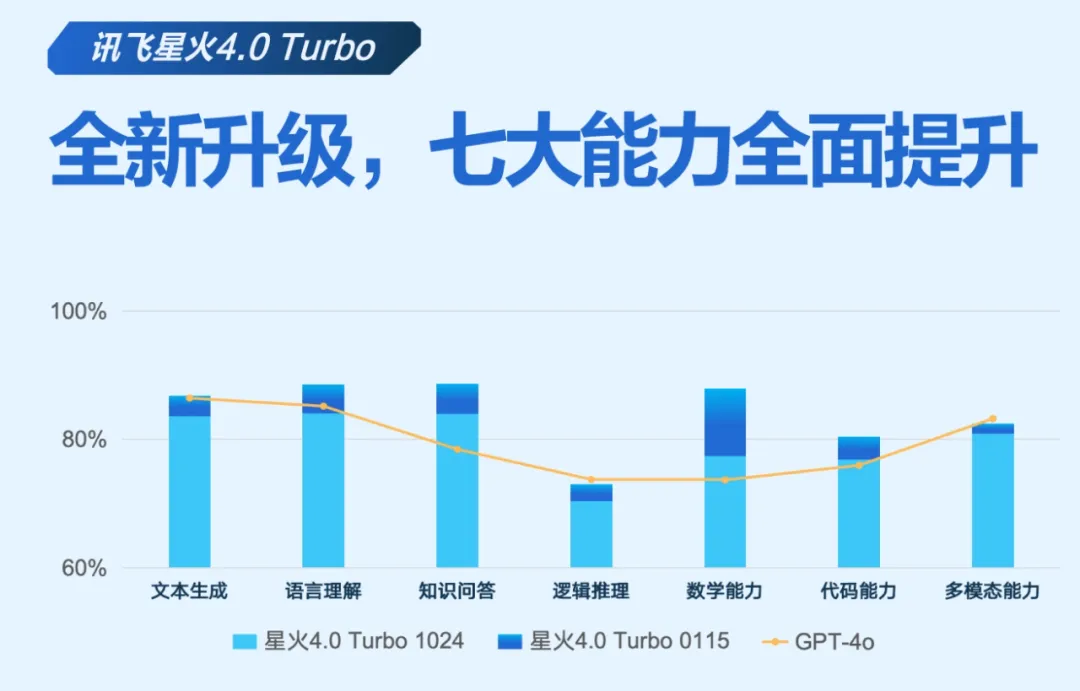 其次,在国产算力底座下,讯飞的基石模型能力也在持续迭代。以讯飞星火4.0 Turbo为例,全面对标OpenAI GPT-4o,在文本生成、语言理解、知识问答、逻辑推理、数学、代码和多模态七大核心能力上再度实现了新升级,且在数学能力、行业知识、图文识别、长文本能力等行业、企业最关注的痛点问题上,底座模型能力也有针对性的提升。