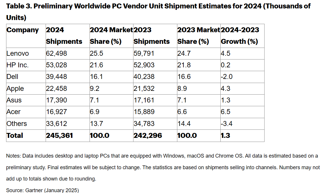2024年,PC市场经历了一段温和的复苏时期,同比增长1.3%。全球PC出货量从2023年的2.423亿台上升到2024年的2.454亿台。