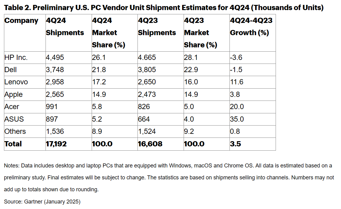 惠普在连续五个季度增长后,本季度表现疲软。戴尔在2024年第四季度再次小幅下滑,与2023年第四季度相比下降了0.1%。