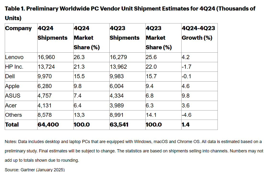 Gartner的数据显示,2024年第四季度全球PC出货量总计6440万台,较2023年第四季度增长1.4%。这标志着出货量连续第五个季度增长。2024年,PC出货量将达到2.453亿台,比2023年增长1.3%。这标志着出货量连续第二年跌破2.5亿台。