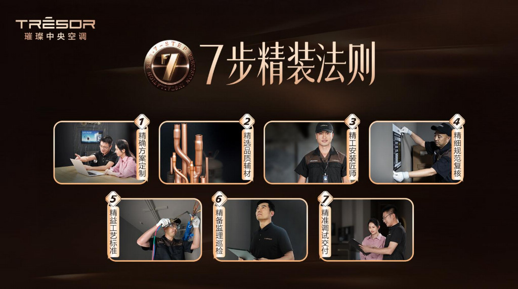 “中央空调的质量,三分靠购买,七分靠安装”,每位消费者对于安装环节的专业性、精确性以及使用效果有着极高的期望,璀璨独创“7步精装法则”,从初始方案设计、品质辅材、巡检复核……到最后的设备调试均设定严苛规范标准,环环相扣,确保每台空调系统达到最佳运行状态。